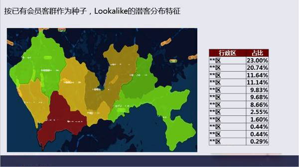 對開發(fā)企業(yè)而言,已有項目的運營操作經(jīng)驗可復(fù)制性高,但在前期定位階段對不同商圈的認知往往無法復(fù)制。結(jié)合大數(shù)據(jù)工具和lookalike算法技術(shù),企業(yè)已積累的消費客群將成為重要的種子數(shù)據(jù),以此作為學(xué)習(xí)對象,將快速模擬出在不同商圈內(nèi)的潛客分布情況。這一重要突破將快速建立項目定位和目標(biāo)客群間的映射關(guān)系,極大提升企業(yè)入駐陌生商圈的成功率。