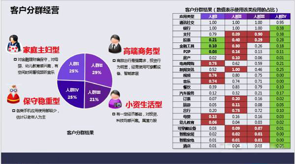 在對商圈人群完成360度用戶畫像后,可從不同維度實現(xiàn)對人群的分類管理。在已有的實踐嘗試中,年齡、婚姻狀況、車輛保有情況、性別、設(shè)備品牌、應(yīng)用偏好都可稱為進一步交叉分析、聚類分析的基礎(chǔ)維度。結(jié)合該商業(yè)地產(chǎn)企業(yè)的自身需求,華錦億爵大數(shù)據(jù)技術(shù)團隊以線上應(yīng)用偏好作為最重要的聚類基礎(chǔ),將商圈內(nèi)人群分為偏好差異明顯的幾種不同類型,從而便于把握不同類型客群的消費特征,為商業(yè)主力客群的選定準(zhǔn)備了有力的數(shù)據(jù)支持。